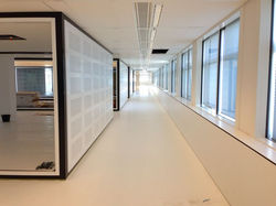 In de showroom staan 4 grote boxen met ieder een eigen ‘look & feel’. In deze ‘kijkdozen’ kun je verschillende kantoorconcepten van Ahrend ervaren. Mijn favoriet was de box met het thema ‘natuur’. Hier hebben we groenwanden toegepast en bijzondere boom-kolommen ontworpen die de klimaat beheersing kunnen regelen. Ook is het spanplafond hier bijzonder, deze kan het daglicht simuleren. Verder kon ik een grote wens in vervulling laten gaan, door eindelijk eens een tafel aan het plafond te hangen in een interieurontwerp. Dit is een echte eye-catcher geworden in het entree gebied. Op de route door de showroom volgt na het entreegebied met bar, garderobe en lockers de ‘tribunetrap’, hier kunnen presentaties worden gehouden en productdemonstraties worden gegeven.