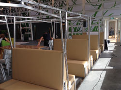 In dit speels ingerichte bedrijfsrestaurant heb ik de coupe-zitjes ontworpen, die refereren naar de parallel voorbij rijdende treinen. Uit een fijne tekening van stalen profielen vormt zich het silhouet, het is hierdoor een luchtig geheel gebleven. Het element geeft als vast object een fijne structuur aan de grote ruimte en biedt weer een andere mogelijkheid van verblijven.